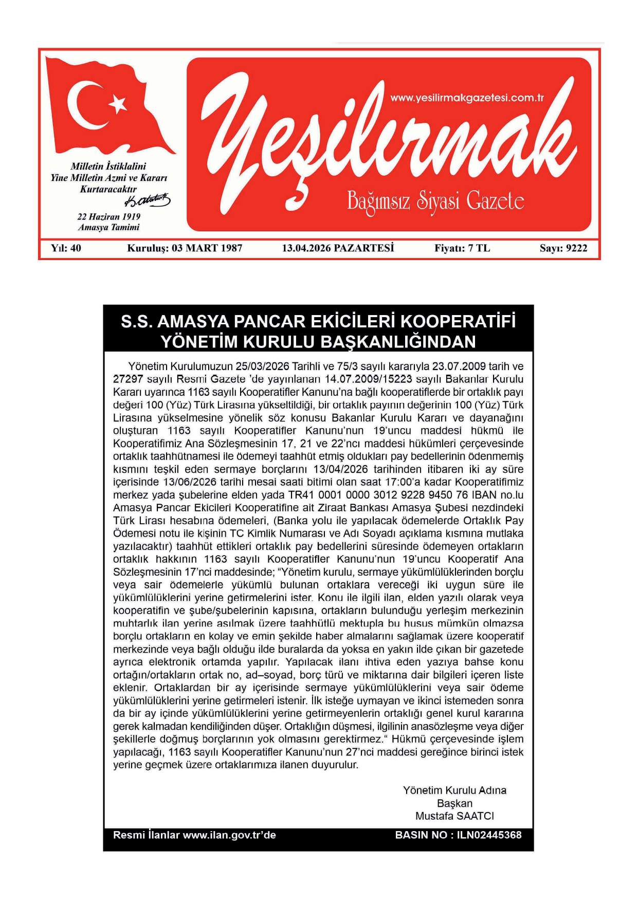 S.S.AMASYA PANCAR EKİCİLERİ KOOPERATİFİ YÖNETİM KURULU BAŞKANLIĞINDAN